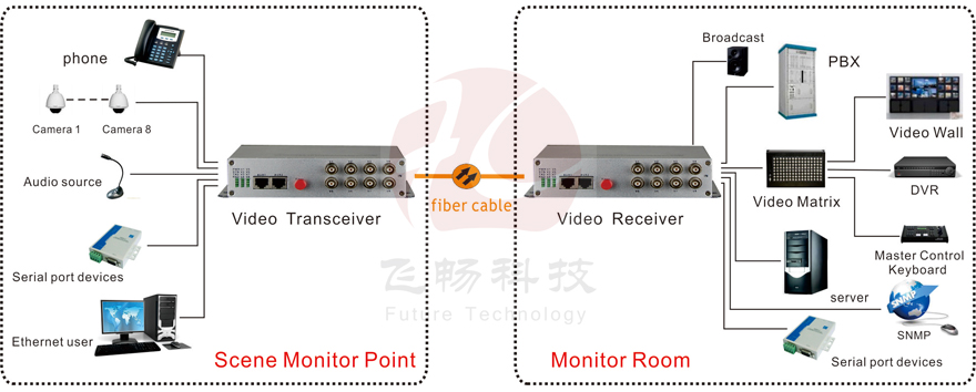 This digital video optical transceiver adopts digital video encoding and gigabit optical fiber transmission technology. The multi-channel single-direction bi-direction audio, video, data, telephone, Ethernet and switch real-time synchronization, no-distortion and high quality transmission is on the single-core or dual-core optical fiber. Complete digital video non-compression transmission technology, with video and data condition indicator, can monitor the system normal operation. It uses modular design, the user can flexibly select or customize configuration based on the scene occasion. Rack installation or desktop installation can be optional. This product is made up of optical transmitter and receiver. It can transmit simultaneously 8Channel forward direction video, audio, data, phone, E1, Ethernet and switch.