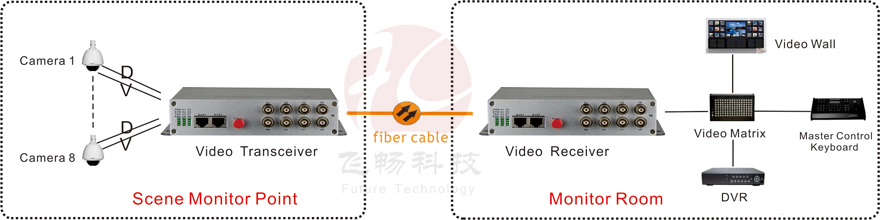 This digital video optical transceiver adopts digital video encoding and gigabit optical fiber transmission technology. The multi-channel single-direction bi-direction audio, video, data, telephone, Ethernet and switch real-time synchronization, no-distortion and high quality transmission is on the single-core or dual-core optical fiber. Complete digital video non-compression transmission technology, with video and data condition indicator, can monitor the system normal operation. It uses modular design, the user can flexibly select or customize configuration based on the scene occasion. Rack installation or desktop installation can be optional. This product is made up of optical transmitter and receiver. It can transmit 8Channel forward direction Video and 1Channel reverse direction RS485 data.