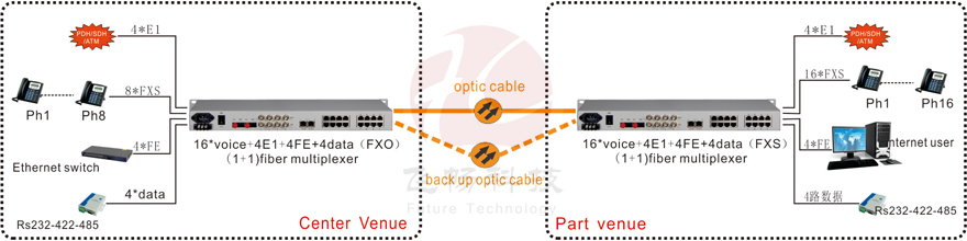 This device provides 16Channel telephone 1-4Channel E1 interface, 4Channel 10M/100M Ethernet interface (Line Speed 100M) and 4 expansion interface. 4Channel Ethernet interface is switch interface, can support VLAN. 4 expansion interface can be used as the transmission channel of RS232/RS485/RS422 asynchronous data, voice signal, 2/4 line E&M audio signal, switch signal, Ethernet signal (Bandwidth 2M). It is very flexible.