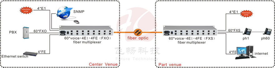 Fiber-60Voice + 4E1 + 4FE Multiplexer